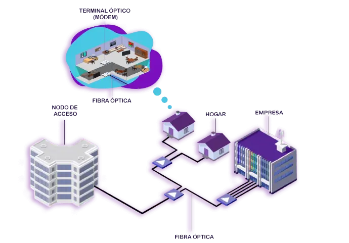 La conexión se extiende desde nuestro Nodo de Acceso más cercano, recorriendo ductos subterráneos o postes hasta llegar a tu ubicación, donde se conecta a un Terminal Óptico (módem) que te brinda el servicio.